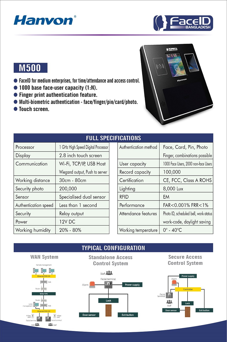 FacelD for medium enterprises, for time/attendance and access control.